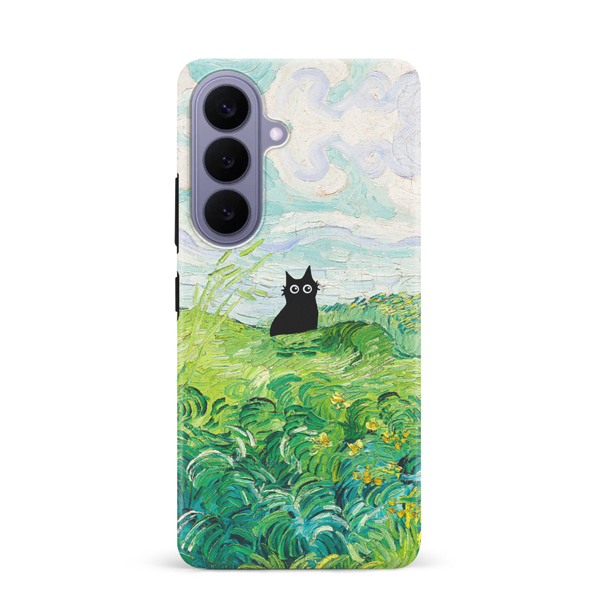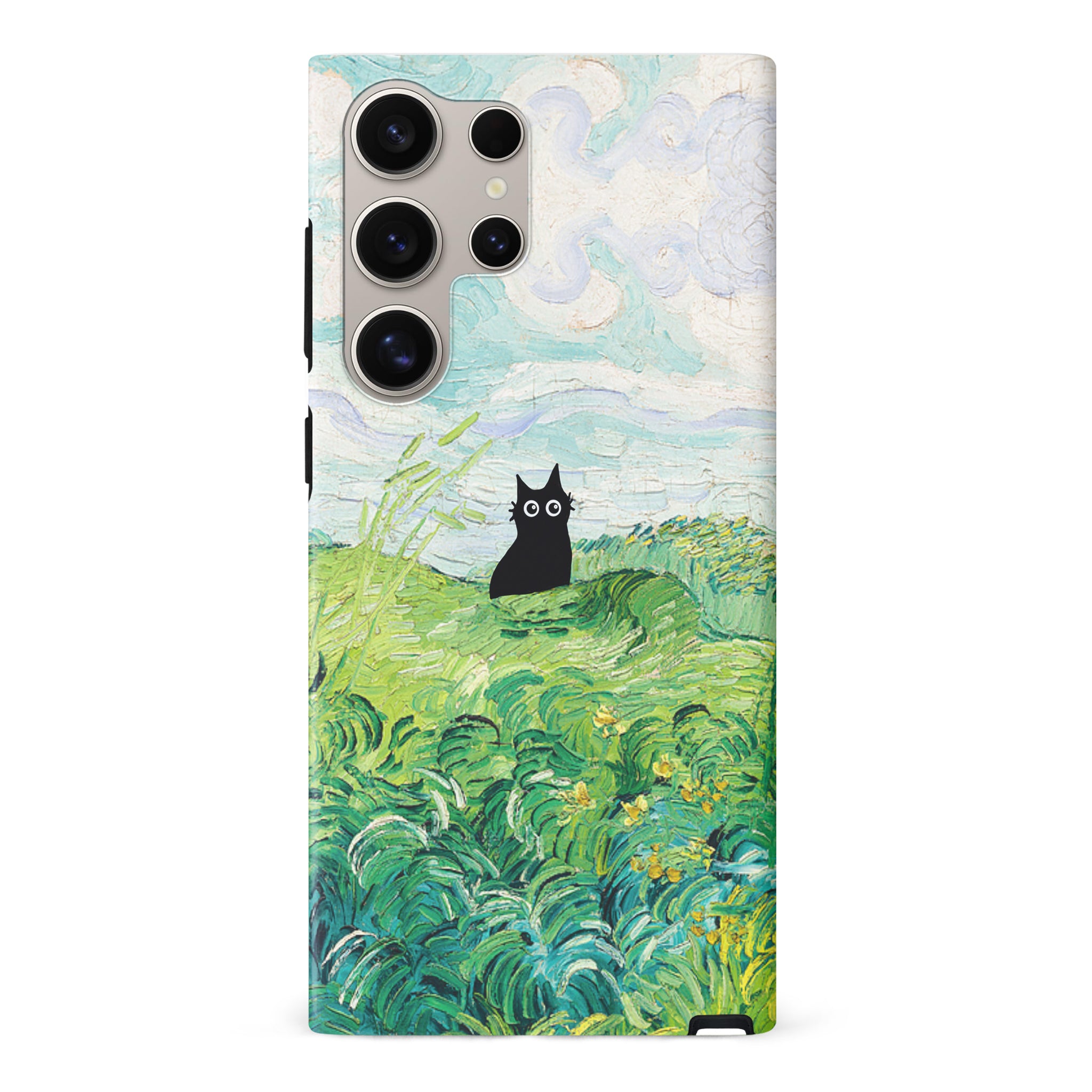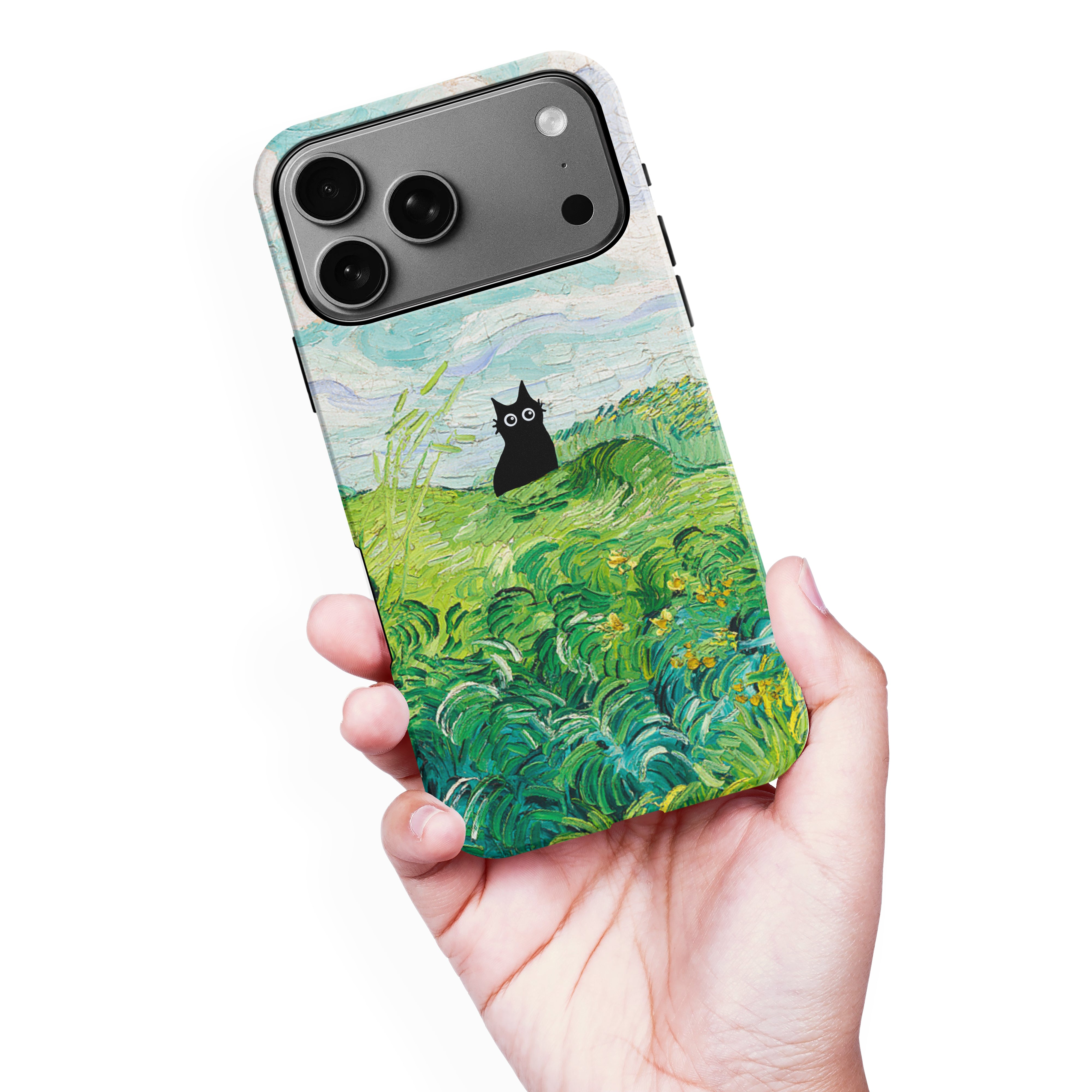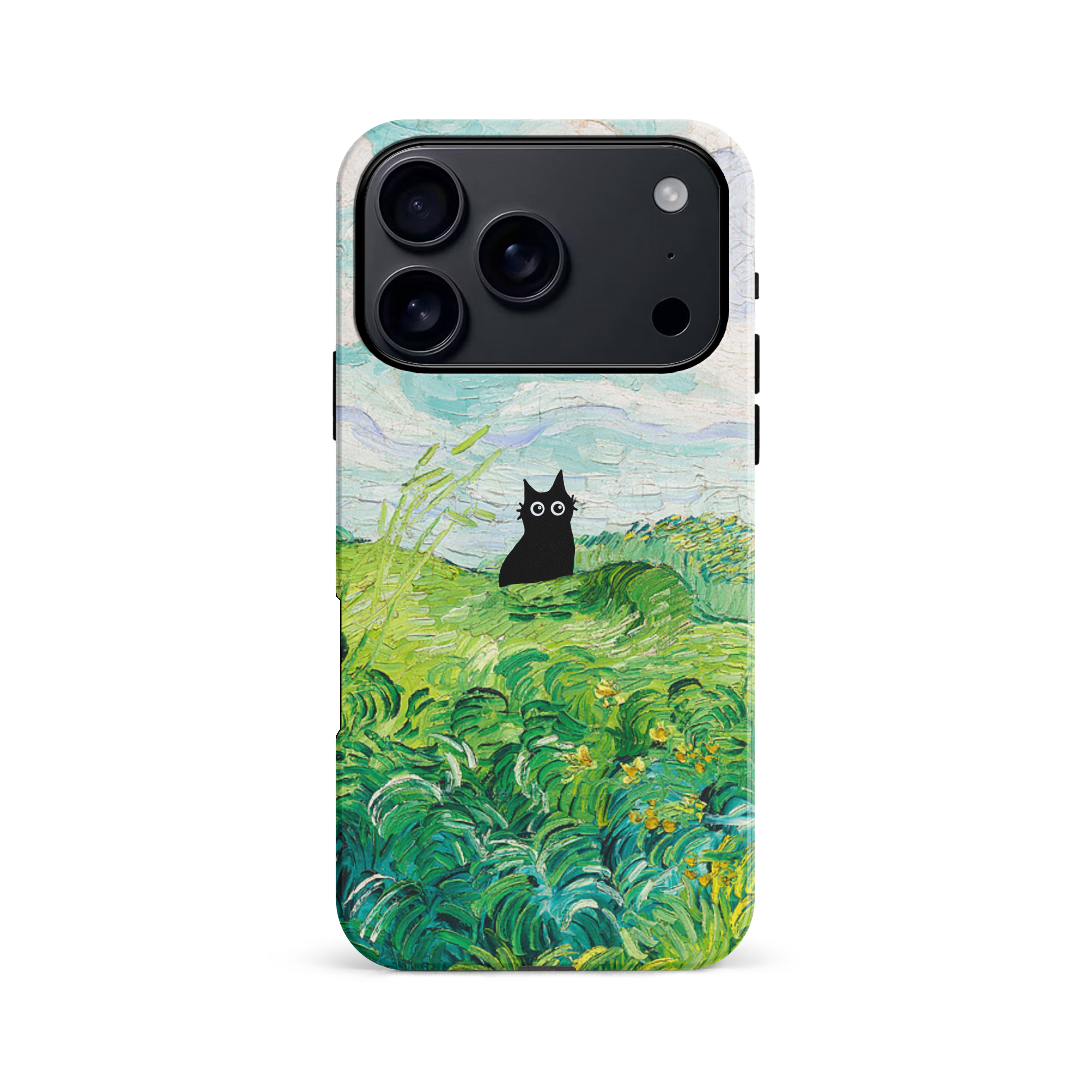The Black Cat is at it again, this time she's perched atop Van Gogh's Green Wheat Fields. Cat lovers, get this impressionist painting phone case for your iPhone, Google Pixel or Samsung Galaxy and Note today!
